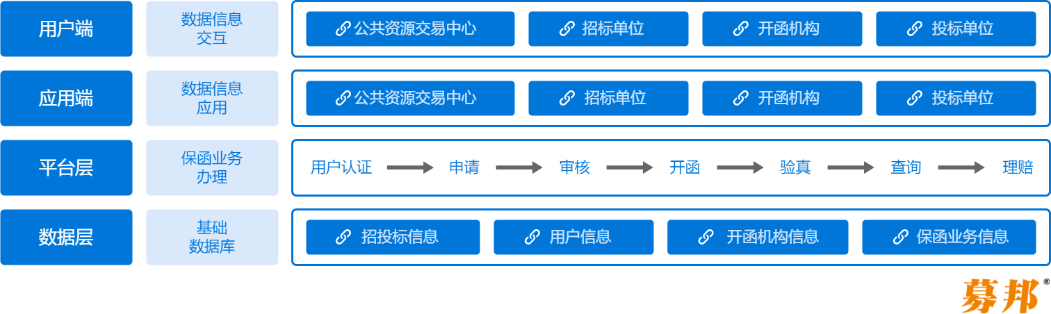 自主研发打造电子保函一站式服务的中易函平台,通过高度集成与智能化的技术架构,为全国各地区、跨行业、多品种的工程项目、政府采购、招投标、融资担保等场景提供一站式电子保函服务。主要在工程建设、政府采购、法院、文旅、海关五大领域,为企业提供一站式电子保函服务,盘活资金,优化营商环境。并从采集、存储、分析、应用四大方面构建数据治理体系,高效累积数据资产,赋能业务应用场景,发挥数据资产价值。
