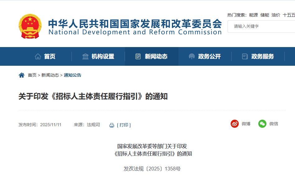 国家发展改革委等部门关于印发《招标人主体责任履行指引》的通知 发改法规〔2025〕1358号