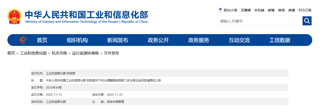 近日,工业和信息化部、财政部发布《关于优化调整国务院部门涉企保证金目录清单的公告》,其中包括投标保证金、履约保证金、政府采购投标保证金、政府采购履约保证金等22项保证金。