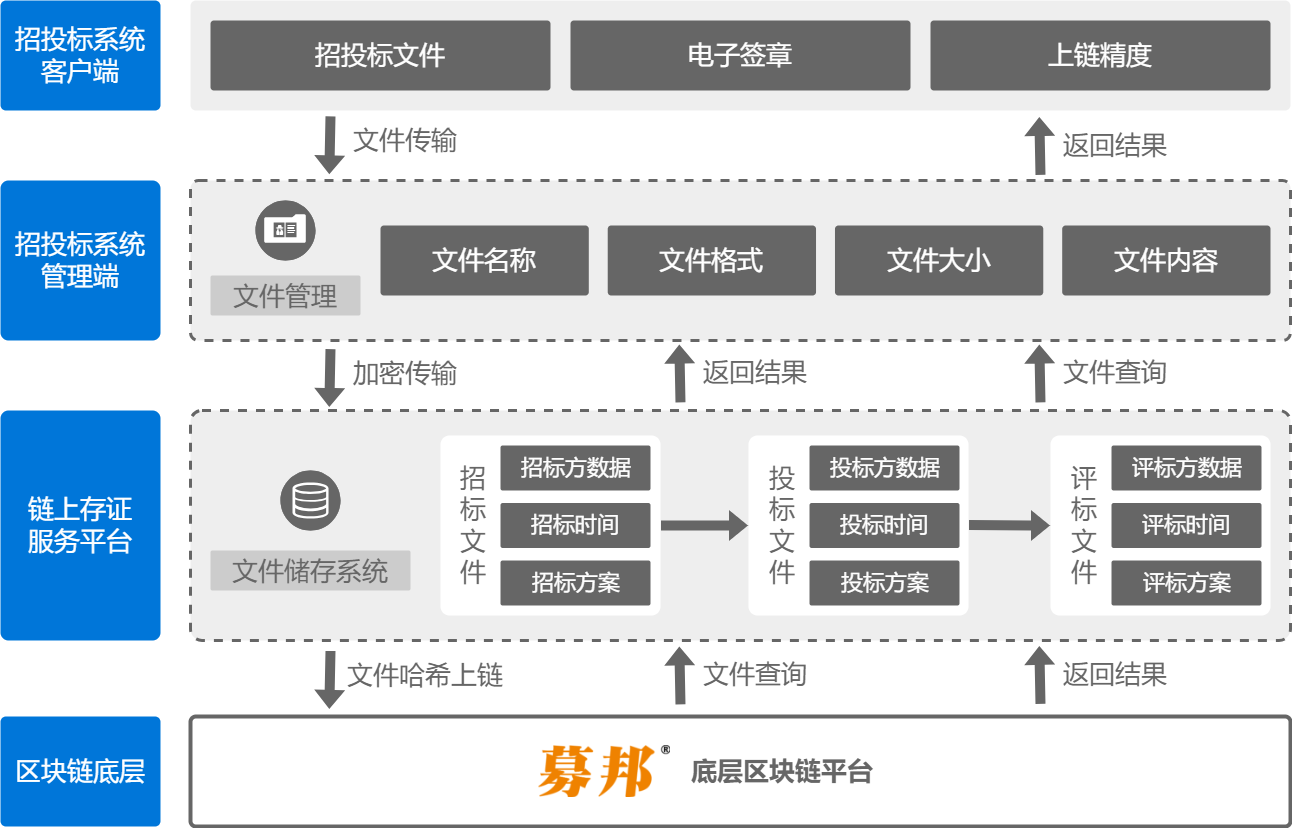 系统结合互联网+、大数据及人工智能发展,设计与搭建基于区块链技术的电子招投标架构模型,主要从业务流程、监督管理、数据管理及技术一体化的角度融合招标采购业务活动,实现去中心化交易,达到公开透明的可信场景,搭建监督通道,预警交易风险,追溯历史交易,合规招标采购交易流程。