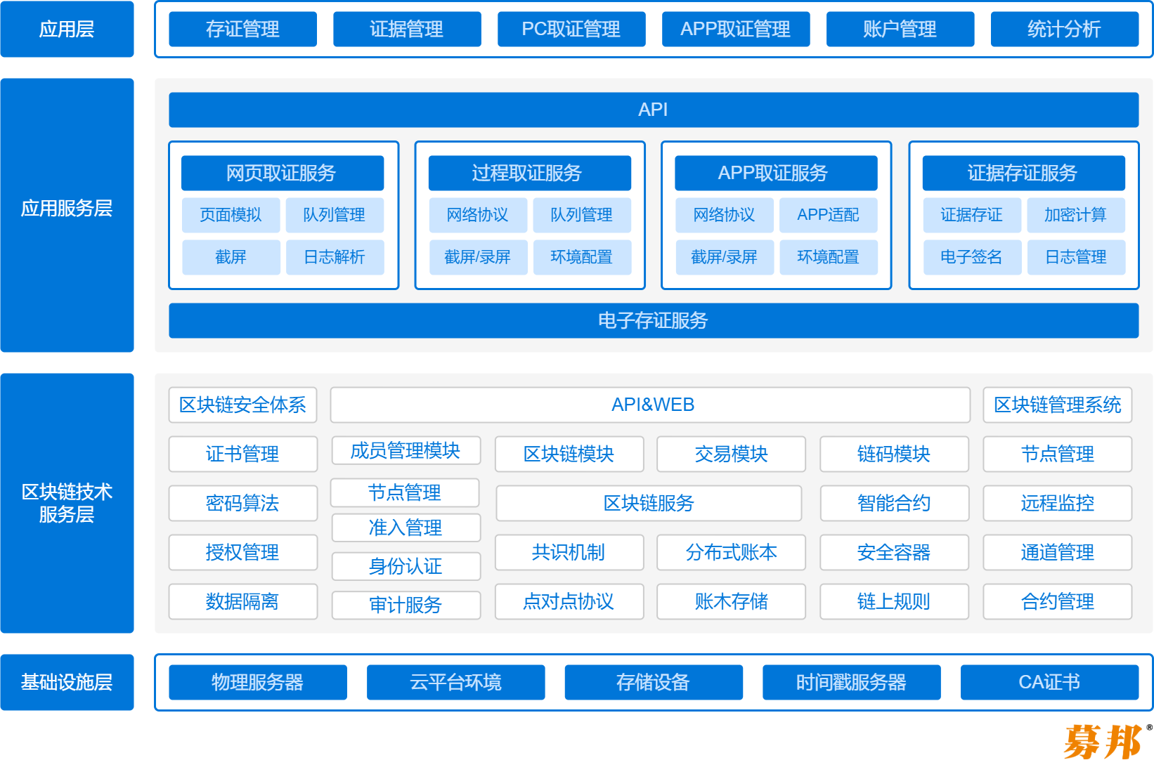 募邦数据存证技术架构包含以下关键组成部分,这些组件共同构成了一个完整的数据存证技术架构,旨在提供一个安全、可靠且去中心化的数据存证平台。